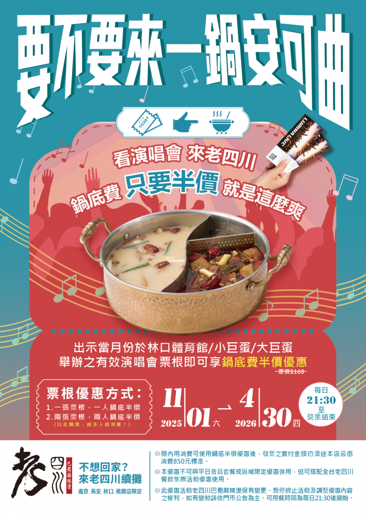 活動期間內21:30(含)後凡至指定門市(桃園/林口/南京/長安店)用餐單點,持有並出示當月份於林口體育館、小巨蛋、大巨蛋舉辦之演唱會票根,即可享有鍋底費半價優惠(原價$168)