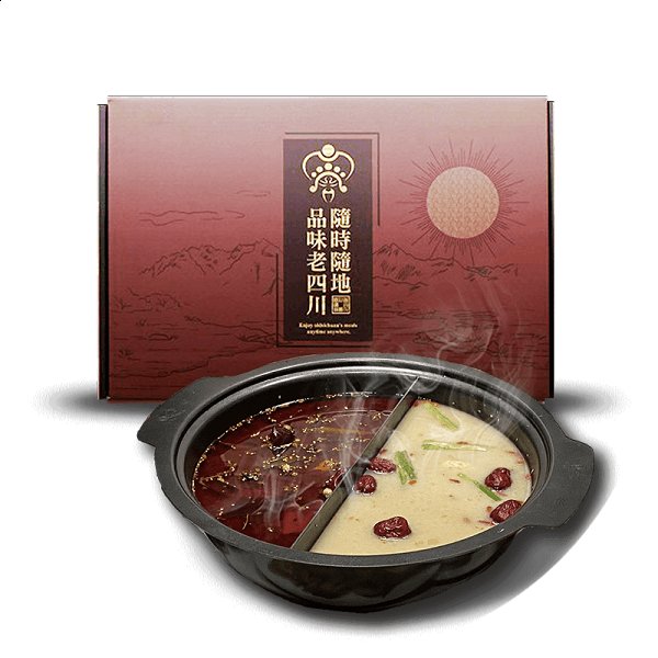 雙味鴛鴦湯盒,每盒內含麻辣湯底2包(內含鴨血及豆腐),以及養生湯底2包。